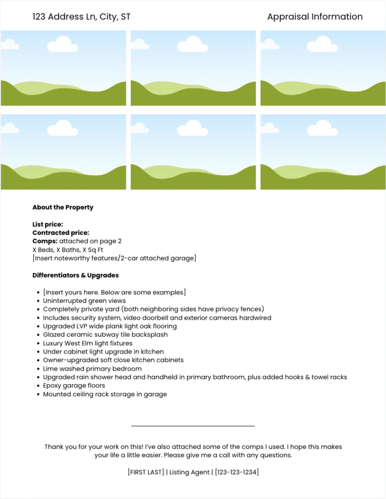 No need to overcomplicate it. Use this 2-page template and come prepared to meet the appraiser.