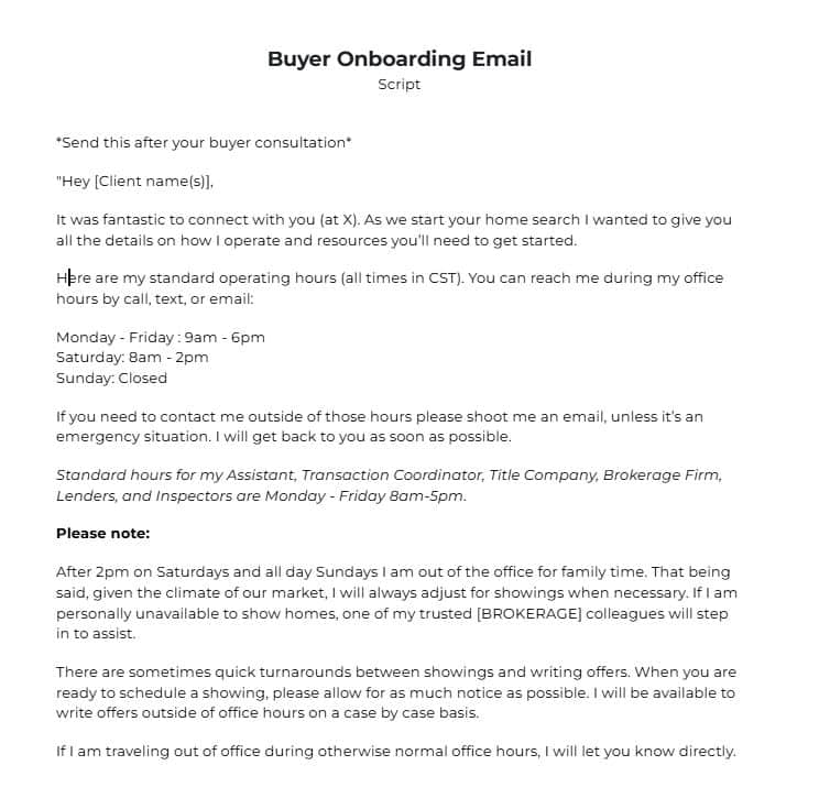 A ready to use email script for real estate agents to set expectations after the buyer consult, outline availability, and kick off the search with clarity and confidence.