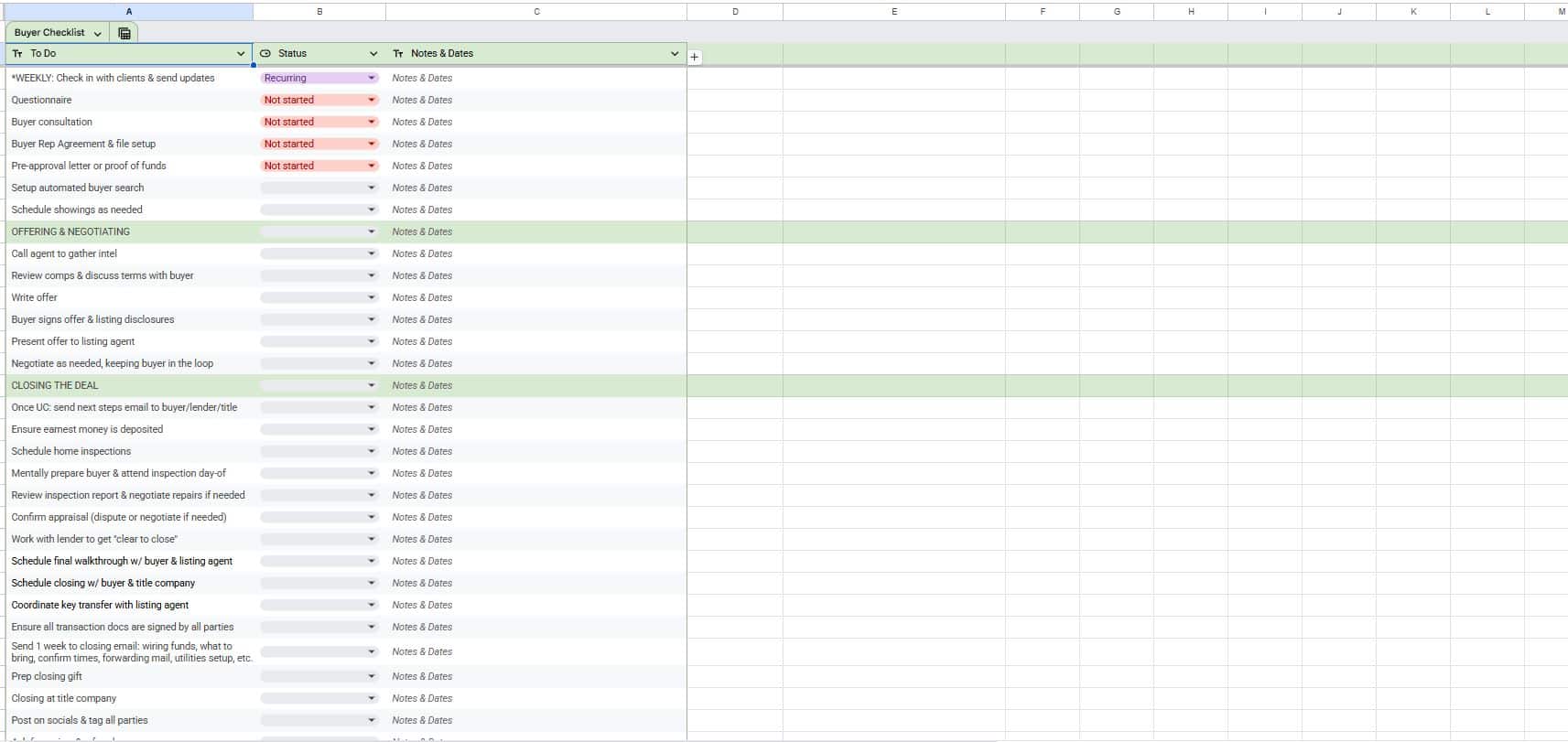A ready-to-use checklist for real estate agents that guides a buyer from first contact to keys-in-hand. Use it to structure intake, keep financing and contingency deadlines tight, and deliver a calm, predictable experience your clients trust.