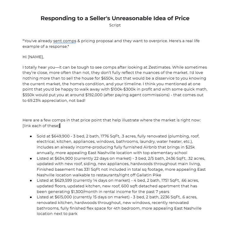 A ready to use script for real estate agents to professionally address overpricing, align expectations with comps, and keep rapport strong while protecting the listing strategy.