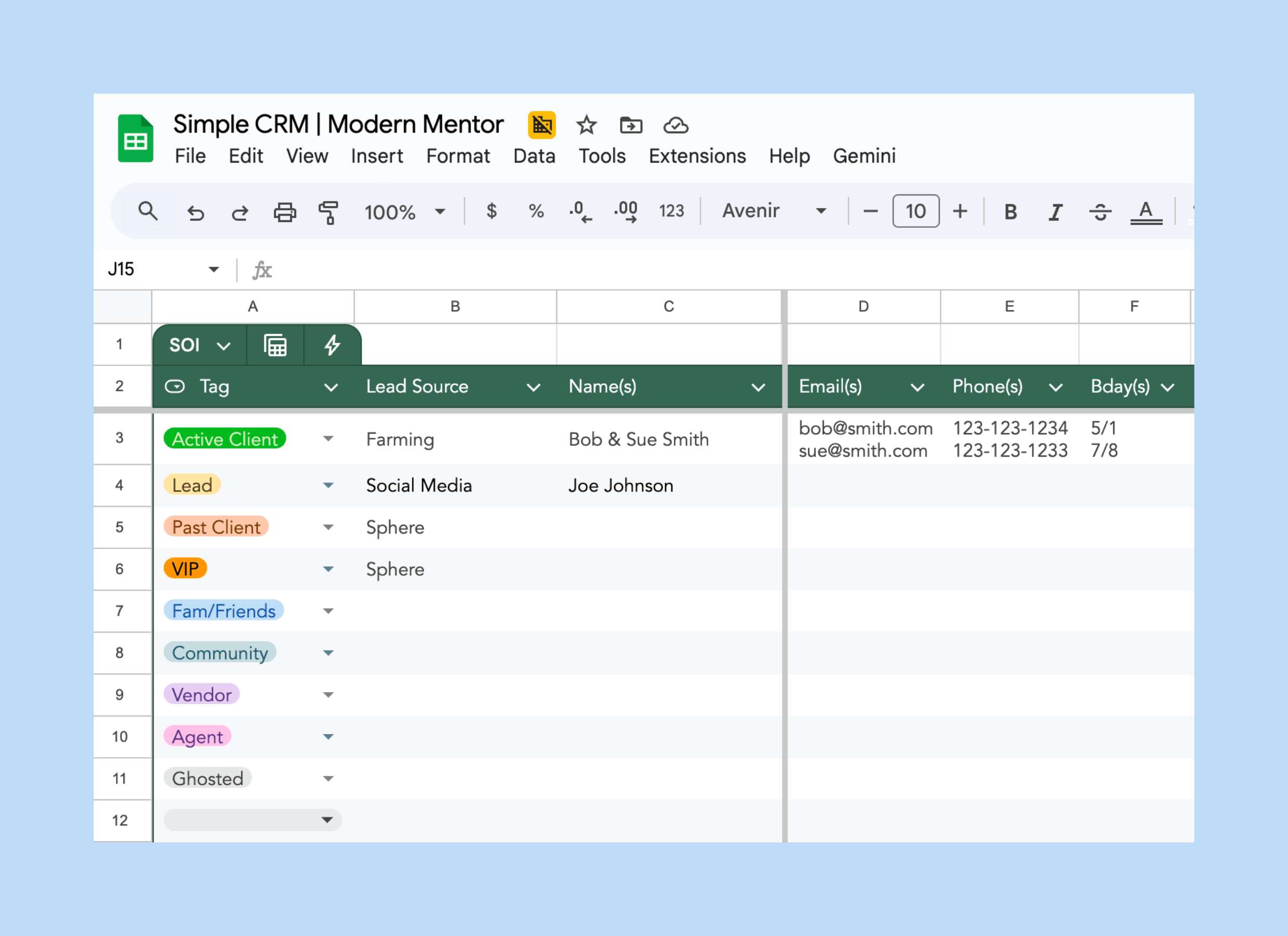 • Full CRM sheet with tags and lead source prepped